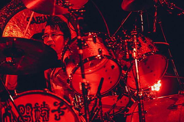 「『踊る一寸法師』再発ツアーということで、当時の1曲目、2曲目の再現をしてみました。「モスラ」は25年ぶりに演奏しましたよ。次に聴けるのは25年後です」と鈴木が言うと、「なかなか手に入らなかった、あのプレミアムな『踊る一寸法師』が再発の運びとなりましたよ。今日は生配信(*海外/日本と有料生配信)をしております。無駄に盛り上がっていきましょう!」と和嶋は呼びかけ、昨年8月に出た最新22thアルバム『苦楽』のラスト曲「夜明け前」をプレイ。中盤、「ドンドンパン!」とQUEENの「We Will Rock You」ばりのドラムと共に「燃えろ 燃えろ 日の光」の歌詞が追いかけると、観客はハンドクラップで参加。ストーリー性豊かなドラマティックな曲展開といい、暗い世の中に希望の光を射し込む至福の名曲と言っていい。