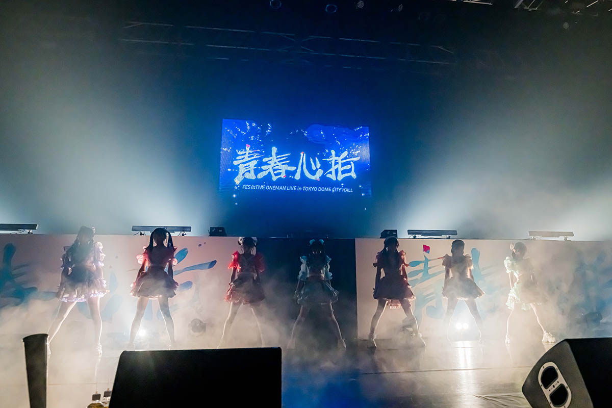「デビューした頃から、わたしの目標はTOKYO DOME CITY HALLでワンマンライブをすることだったので、夢が叶えられてすごく嬉しいし、ここまでこれたのは、今まで少しでも応援してくれみなさんのおかげです。みなさんのおかげで、わたし達は今、ここに立っています。わたしは今日で最後のワンマンライブを迎えて、来月卒業となるんですけど。でも、本当にここまでFES☆TIVEみんなと一緒に走ってこれたわたしはすごい幸せでした。みなさんと最後まで最高のライブを作っていきたいし、FES☆TIVEが一番楽しいライブを作れるグループだと信じてわたしは頑張ってきたので、これからもみなさんと楽しいライブを作りたいです」(青葉ひなり)まだまだ宴は続くと言わんばかりに、FES☆TIVEは『ハレとケ!あっぱれ!ジャパニーズ!』をブースト。メンバーと会場中の人たちが一緒に踊りながら左右へ大移動すれば、7人がステージの上をくるくる回るのに合わせ、フロアにいくつものサークルが誕生。「クレイジー フリーキー もっともっとおバカになっちゃおう」という歌詞の一節通りの景色が、そこには生まれていた。最後にFES☆TIVEは『青春ハートビート』を歌い、終わらない青春の物語をこれからも一緒に作り続けようと、仲間たちと約束を交わしていった。