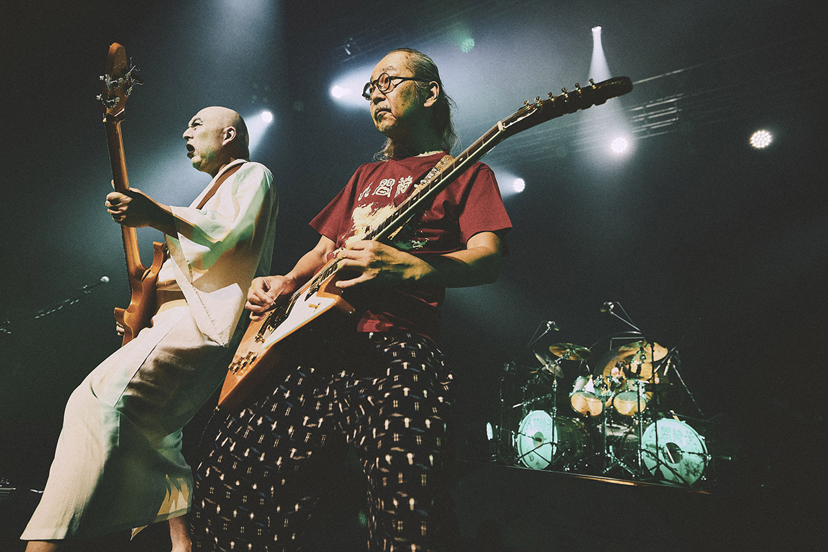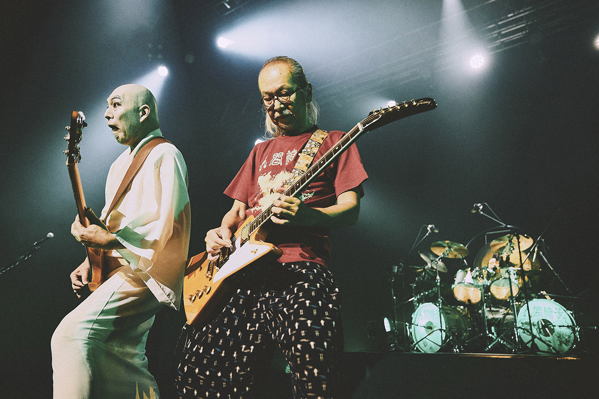 「感動の坩堝」では、キャリアを重ねてきた彼らならではのストレートな感情を歌い、「遺言状放送」では、狂気に彩られたキャッチーさが観客を支配する。新たなキラーチューンとなった「ばかっちょ渡世」は、この3人だからこその絶妙な掛け合いが随所に光り、観る者を自然と笑顔にさせる。そこへ「みなしごのシャッフル」が妖しさ満点の魅力を放って絡みつく。最新作『まほろば』収録曲とレア曲が交互に繰り出される構成がなんとも嬉しい。ファン心理を心得た選曲と配列の妙に拍手を贈りたくなる序盤の流れである。