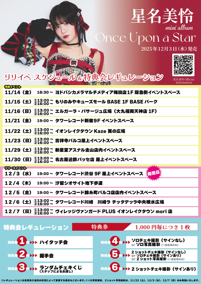 星名美怜2025年12月3日(水)発売mini album「Once Upon a Star」の発売を記念し下記会場・日時にてリリースイベントを実施いたします。下記をご確認の上、皆様のご参加をお待ちしております。
