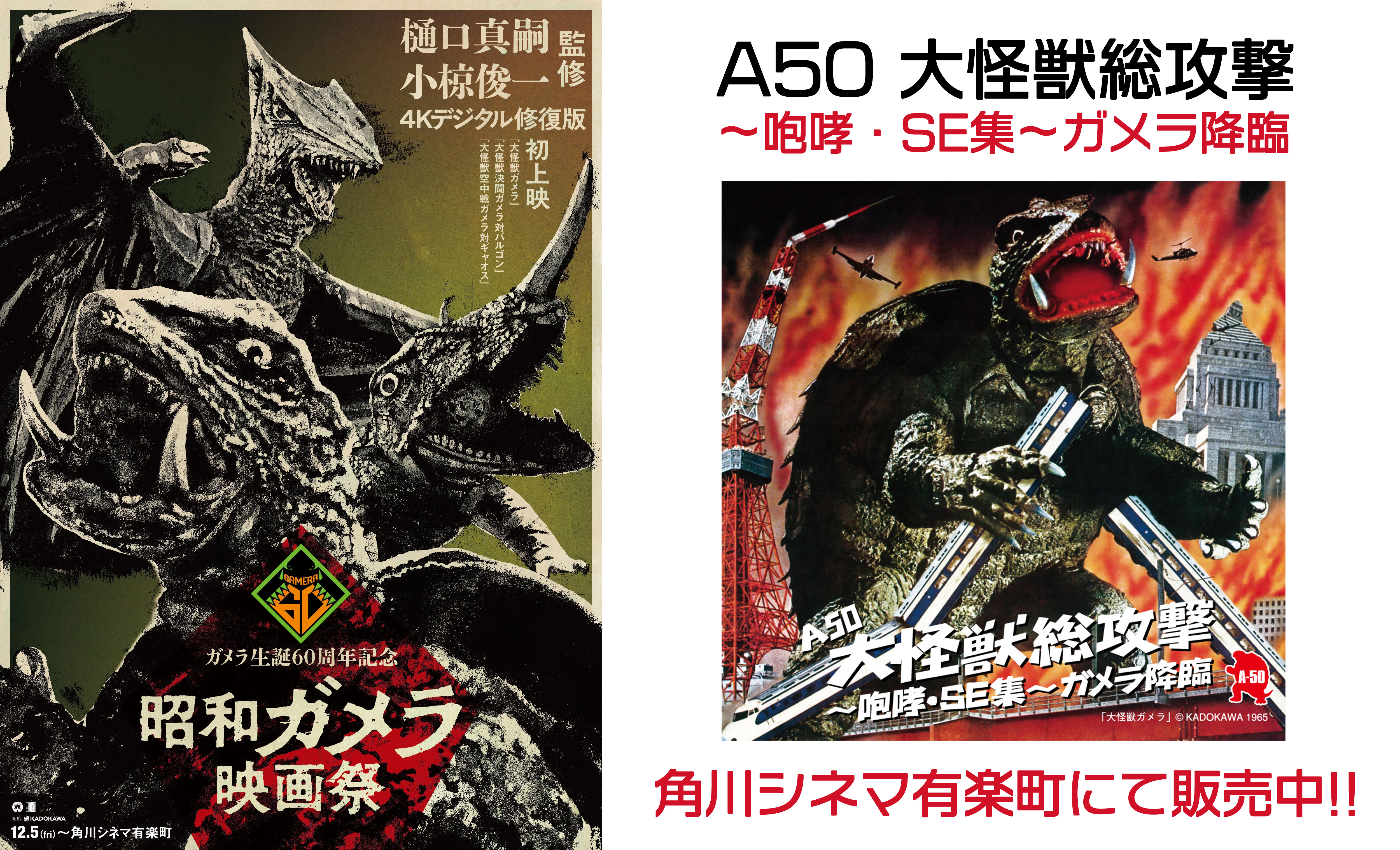 ガメラの生誕60周年を記念して、全国の映画館にて「昭和ガメラ映画祭」が開催されており、『大怪獣ガメラ』、『大怪獣決闘 ガメラ対バルゴン』、『大怪獣空中戦 ガメラ対ギャオス』4Kデジタル修復版ほか、ガメラ作品が絶賛上映中です!! 角川シネマ有楽町ではコンピレーションCD「A50大怪獣総攻撃~咆哮・SE集~ガメラ降臨」が販売されておりますので、お近くの方はぜひお立ち寄りください!! CD詳細はこちら
